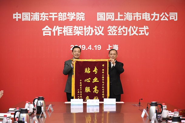 学院办公厅副主任姜建耀代表学院向国网上海电力赠送锦旗。与会领导共同见证签约仪式。