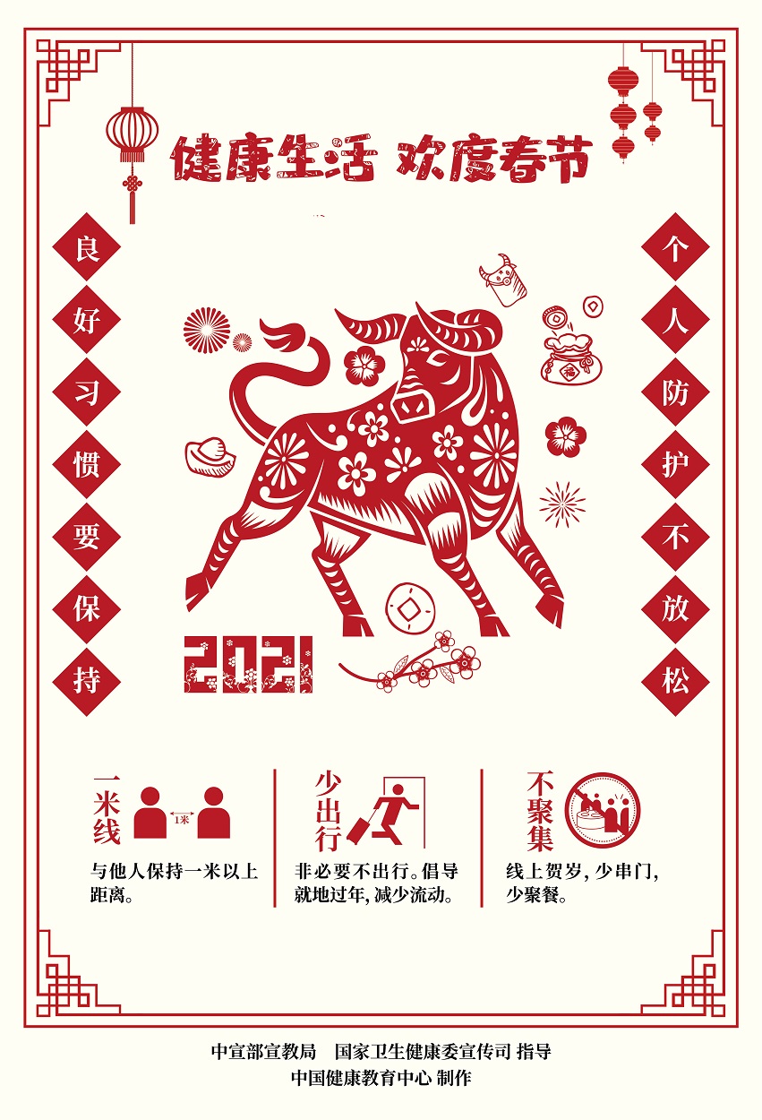 牛年将至,在欢度春节之际,我们依旧要做好疫情防控。近日,中宣部宣教局、国家卫生健康委下发系列防疫海报,围绕勤洗手、戴口罩、常通风、少出行、不聚集、用公筷、讲节约等日常行为习惯,倡导大家在节日期间做到“个人防护不放松,良好习惯要保持”。