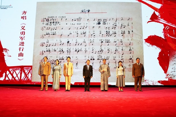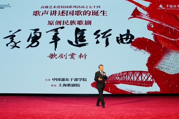 张庆新深入浅出介绍了民族歌剧《义勇军进行曲》的创作历程,结合剧中田汉、聂耳、夏衍、司徒慧敏、王人美等相关历史人物,为学员们描绘了上世纪三十年代以文艺为武器的左翼文化工作者群像。上海歌剧院青年歌唱家黄俊鹏、李忻润、余杨、杨丽莹等人声情并茂地演绎了《演员的荣光》《聂耳入党》《我的武器》《我生长在北平城》等经典唱段,用歌声讲述国歌的诞生,传递信仰的力量。最后,全场齐声高唱中华人民共和国国歌《义勇军进行曲》,全体学员在激昂的歌声中感受着催人奋进的时代力量。