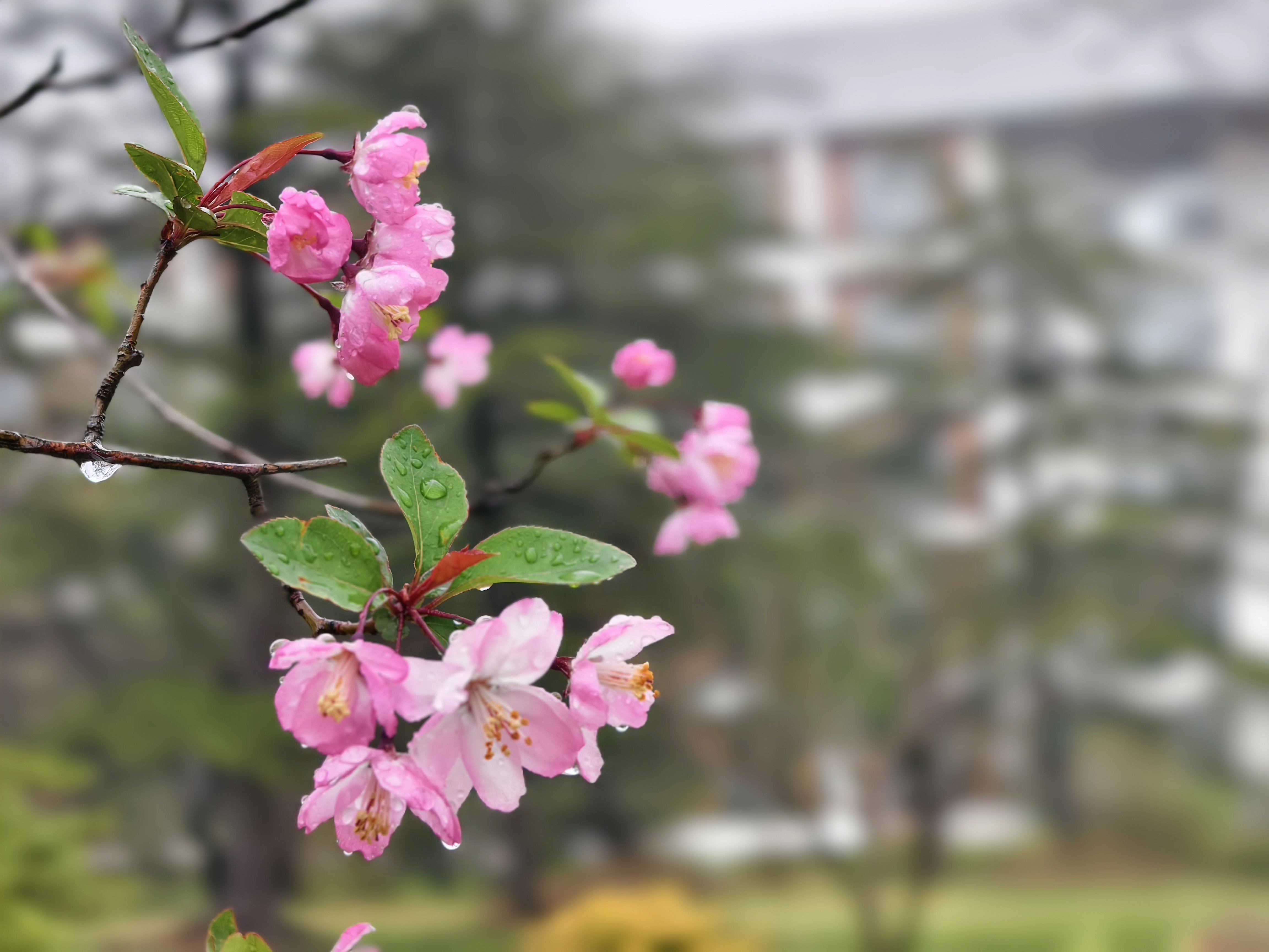 垂丝海棠团花簇簇,轻红浅白,引人流连。